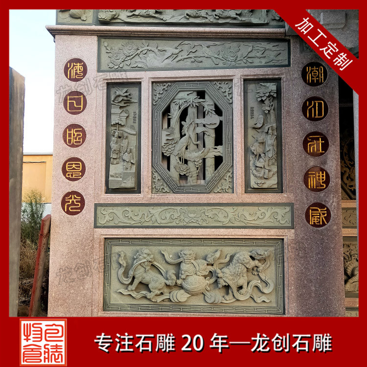 石材浮雕墻作為宗祠建筑中的重要裝飾元素,通過傳統雕刻工藝,將各種圖案、人物、文字等刻畫于石材上,以展現出豐富多彩的宗祠文化內涵。浮雕墻上的石雕作品,既具有藝術性的觀賞性,又承載著宗祠的歷史定位、修建初衷以及家族的傳承精神。而這些石材浮雕墻正是傳承和守護著廣東的家族文化和嶺南文化。