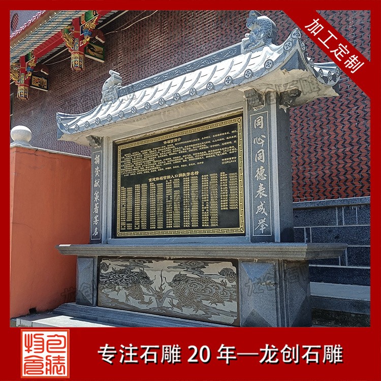 設(shè)計(jì)特點(diǎn):通常由一塊長(zhǎng)方形的石頭精心雕刻而成,上面刻有詳盡的文字內(nèi)容,如表彰對(duì)象的姓名、事跡、貢獻(xiàn)等,以及相關(guān)的圖案或浮雕,以生動(dòng)形象地展現(xiàn)功德事跡的輝煌與偉大。