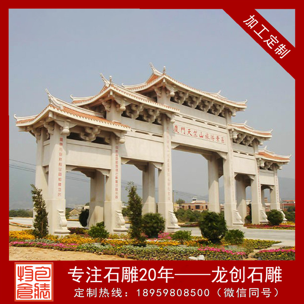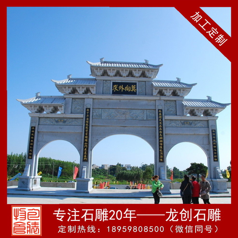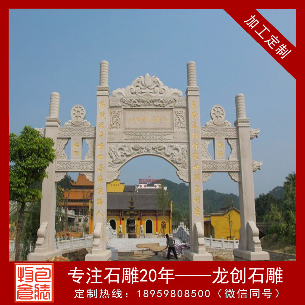 石雕山門是漢族傳統(tǒng)建筑中非常重要的一種建筑類型,用花崗巖修建的石雕山門,是封建社會(huì)為表彰功勛、科第、德政以及忠孝節(jié)義所立的建筑物。也有一些宮觀寺廟以山門作為山門的,還有的是用來標(biāo)明地名的。又稱牌樓,為門洞式紀(jì)念性建筑物,宣揚(yáng)封建禮教,標(biāo)榜功德。建筑是凝固的歷史。