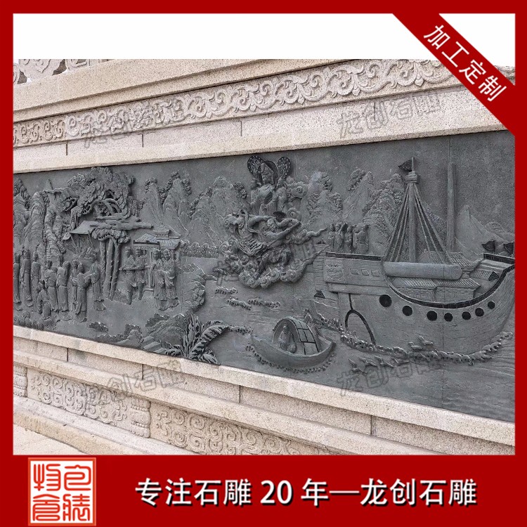 石材浮雕壁畫為圖像造型浮突于石料表面,與沉雕正好相反,是半立體型雕刻品。根據(jù)圖像造型脫石深淺程度的不同,又可分為淺浮雕和高浮雕。淺浮雕是單層次雕像,內(nèi)容比較單一;高浮雕則是多層次造像,內(nèi)容較為繁復。浮雕的雕刻技藝和表現(xiàn)體裁與圓雕基本相同。古今很多大型紀念性建筑物和高檔府第、民宅都附有此類裝飾,其主要作品是壁堵、花窗和龍柱(早期)及柱礎(chǔ)等。