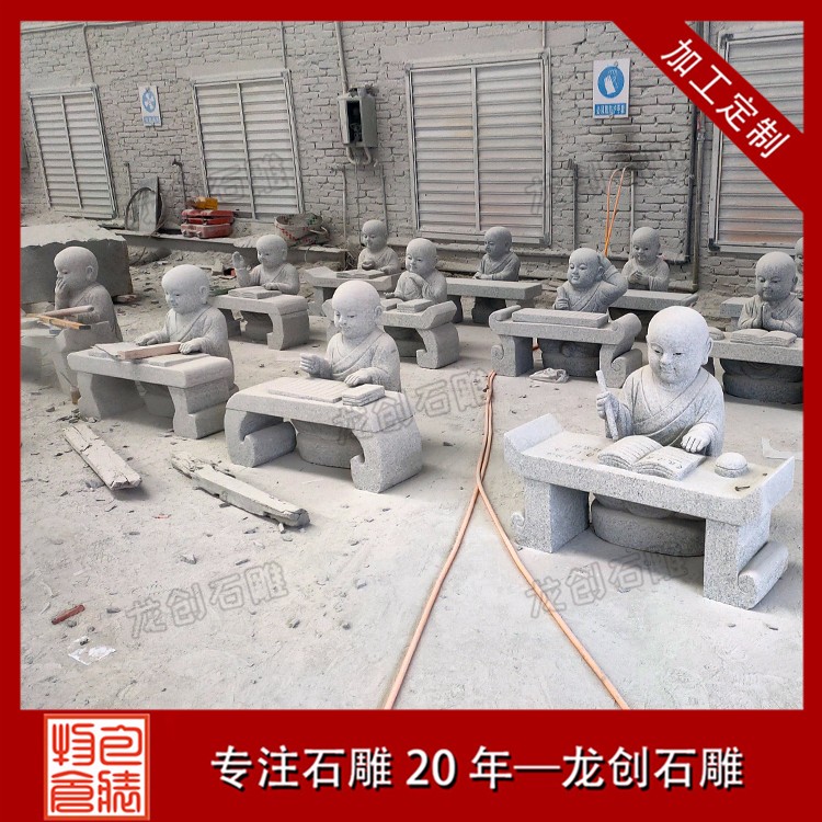 石雕小沙彌擺件造型有做早課晨練的小石雕、有拿著掃把在打掃的小石雕、也有著躺在樹下偷懶的小石雕等等,這些都是根據小和尚這種人物來做成的石雕,也是深受社會上很多人喜歡的。這種石雕的類型在制作上雖然不如一些大和尚石雕那樣莊嚴、慈悲,但是有著屬于他們年齡特點的一些制作雕刻。