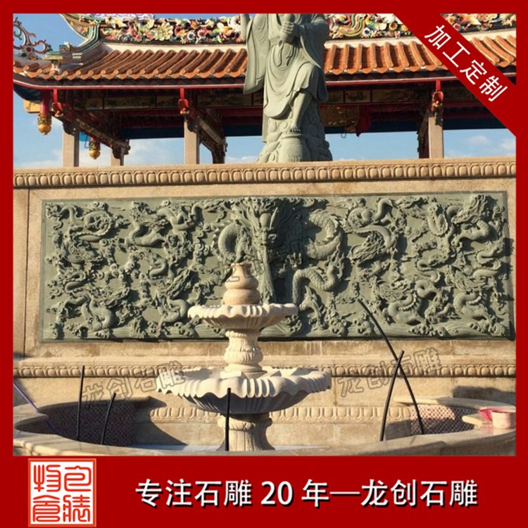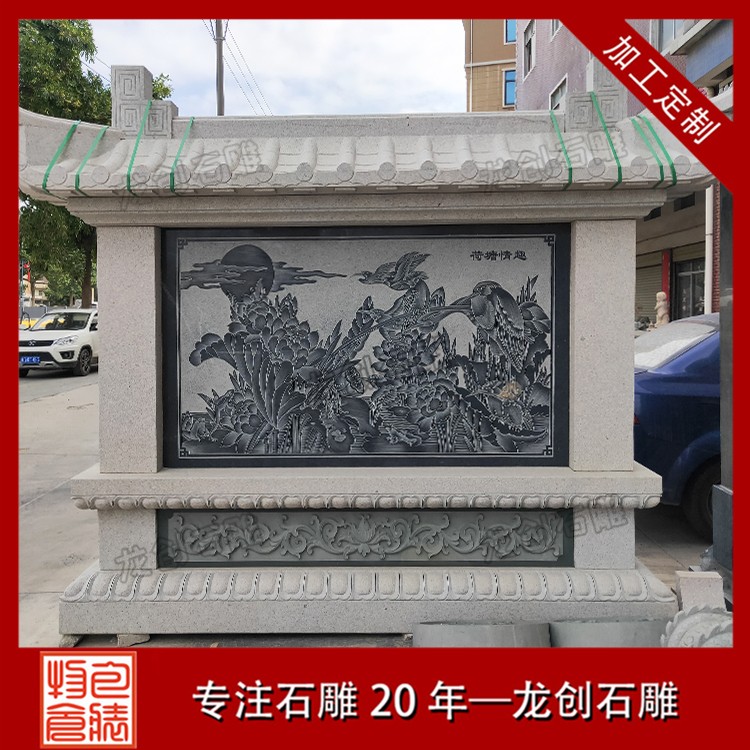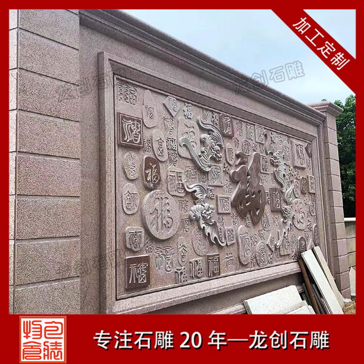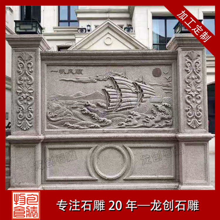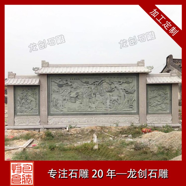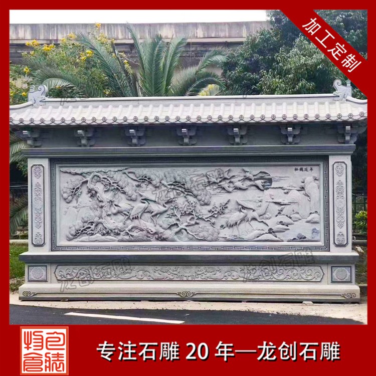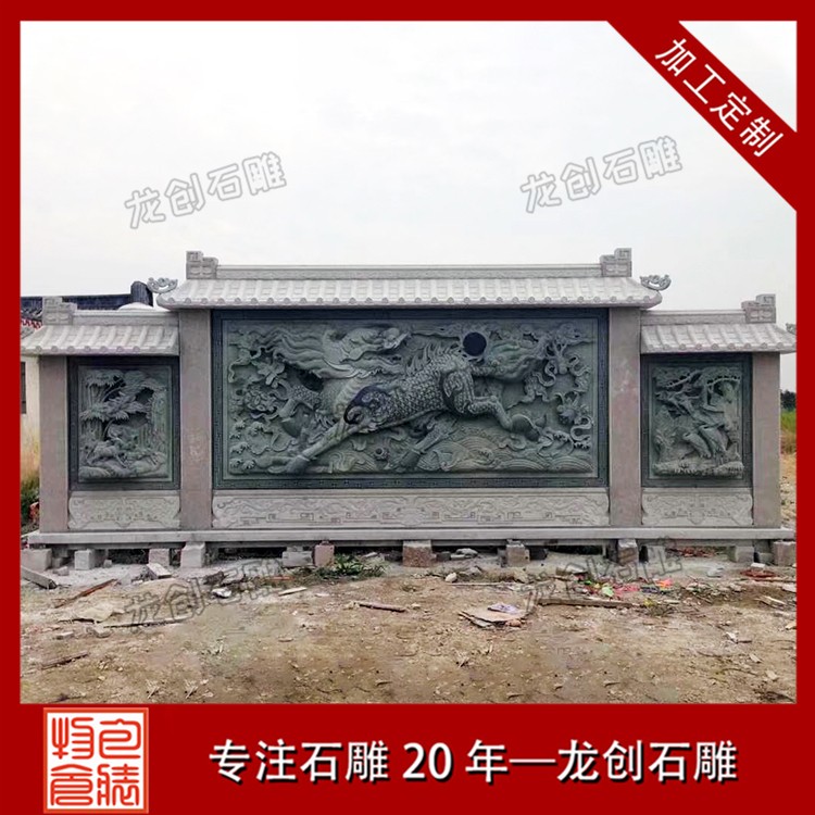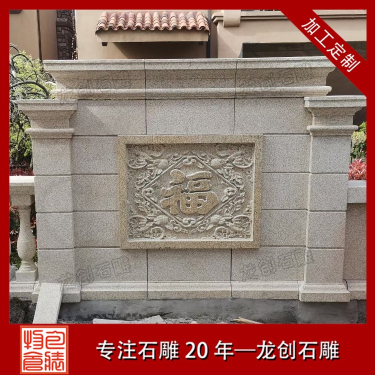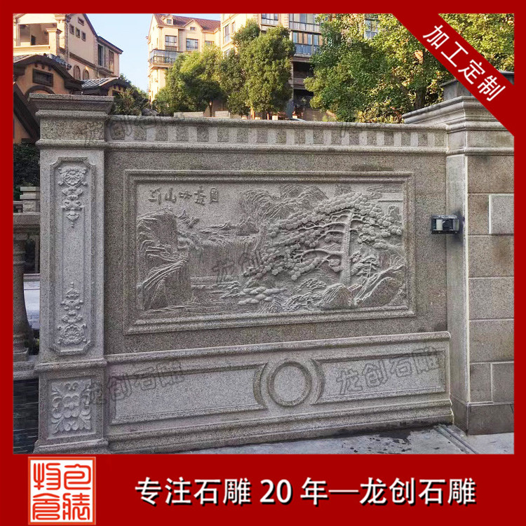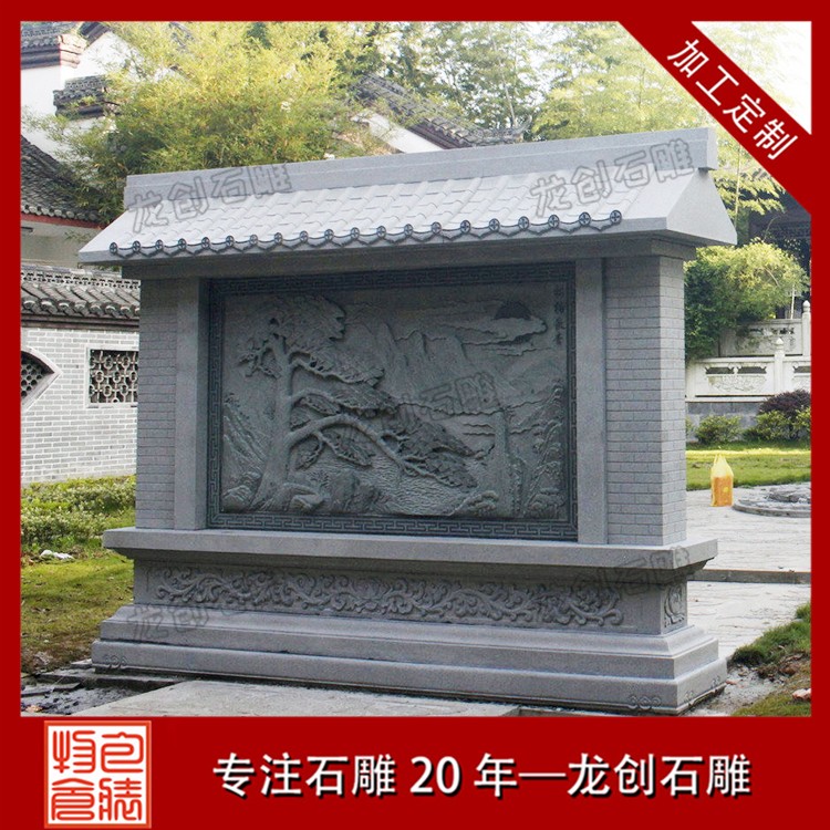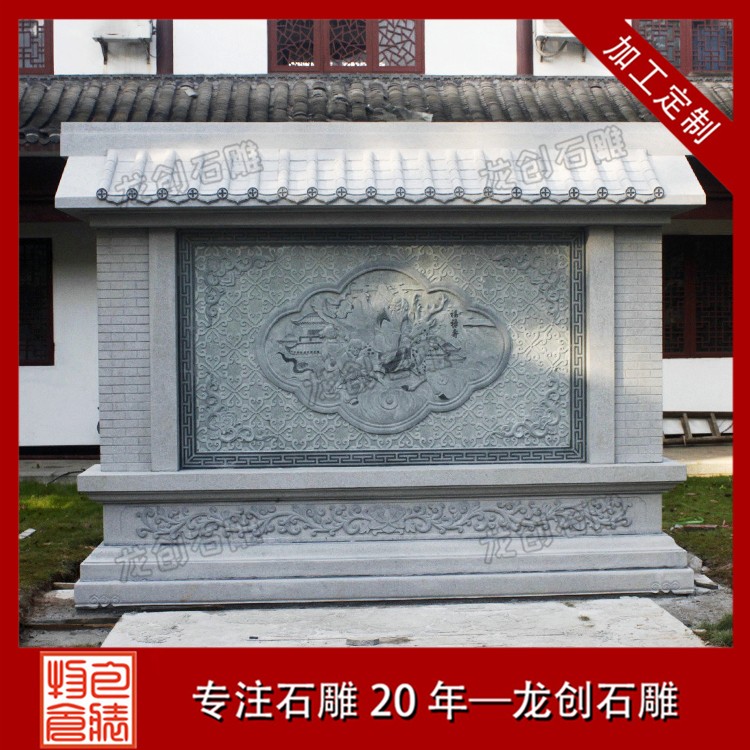 石材浮雕照壁就是用石材雕刻的一種墻面,也稱石雕影墻、石雕照墻,是古代寺廟、宮殿、官府衙門和深宅大院前的一種建筑,即門外正對大門以作屏障作用的墻壁。石雕照墻定制,選惠安龍創石雕。