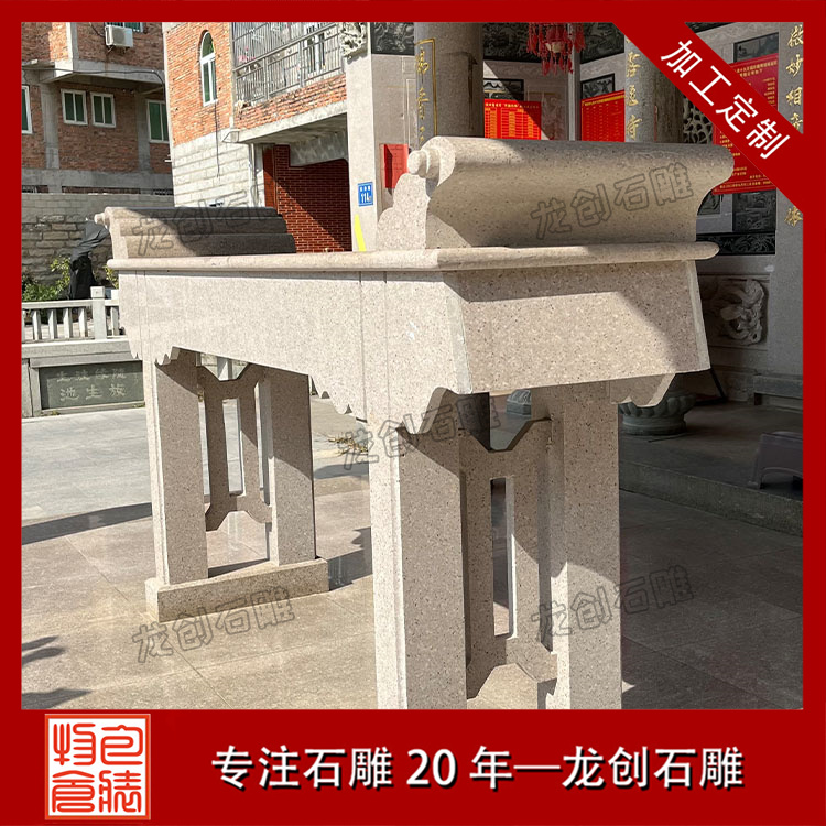 石雕供桌通常擺放于祠堂、廟宇、陵園或家庭祭臺前,用于陳設香爐、供果、鮮花等祭品,是溝通人與天地神靈、祖先靈位的重要媒介。它的存在,不僅是一種儀式的承載,更代表著孝道文化的具象表達,體現人們對祖先的感恩與紀念。