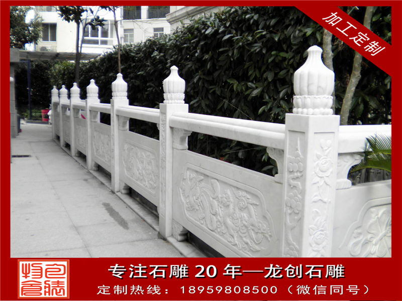 漢白玉欄桿價(jià)格根據(jù)欄板所透圖案的不同價(jià)格也不等,一般的規(guī)則圖形價(jià)格比較便宜,特殊造型和圖案的稍微貴上一點(diǎn);浮雕根據(jù)所要求的深度和圖案的不同價(jià)格不等,雕刻的圖案越深,人工的成本就越高,花鳥(niǎo)的圖案一般相對(duì)便宜些,動(dòng)物人物的相對(duì)來(lái)說(shuō)貴一些??傊褪堑窨痰脑綇?fù)雜,那么價(jià)格就越貴。