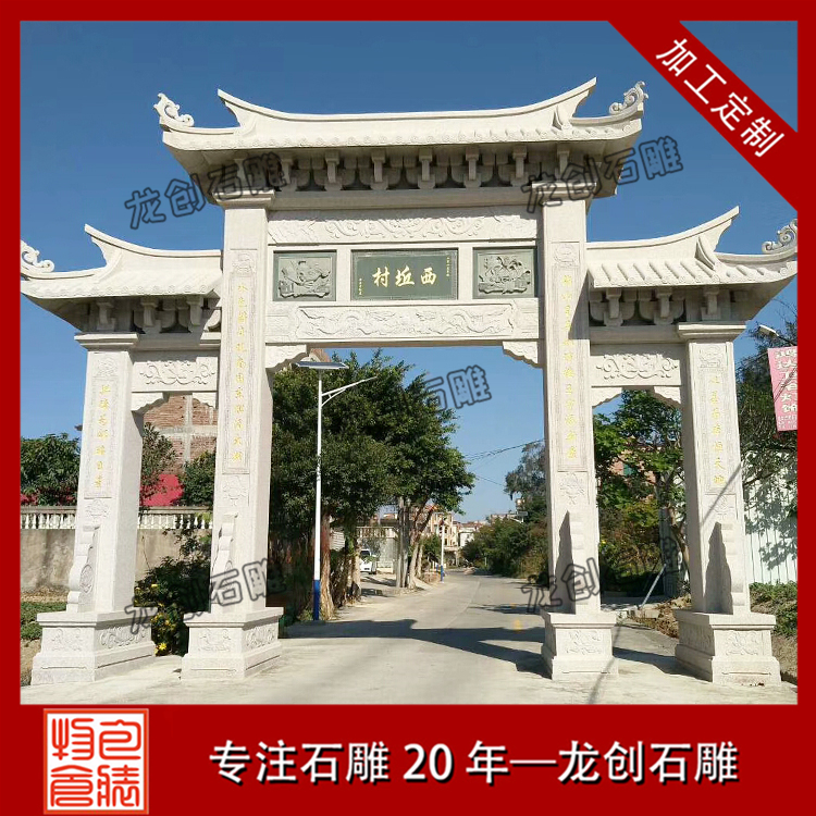 村頭石牌樓制作材質有青石、花崗巖、大理石等,樣式有單門、三門、五門,三樓、五樓、七樓等,雕刻的圖案也是多種多樣,因此村頭石牌樓價格沒有一定的,預算多可選擇的樣式也就多,大理石牌樓價格,請致電我司咨詢,我們會給您一個專業的報價。